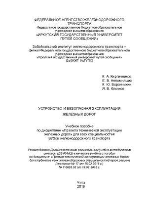 | Валяева О.Н. Социальная политика организацииГод издания: 2016 Описание: методические указания по выполнению контрольной работы |  | Непомнящих Е.В., Клочков Я.В., Ворончихин К.Ю., Кирпичников К.А. Устройство и безопасная эксплуатация железных дорогГод издания: 2016 Описание: учебное пособие Ключевые слова: правила технической эксплуатации, история возникновения, безопасность движения поездов, классификация нарушений, железнодорожные сооружения, габариты приближения строений, габариты приближения подвижного состава, дефекты рельсов, стрелочные переводы, железнодорожные переезды, раздельные пункты, устройства сигнализации, светофоры, диспетчерская централизация, график движения поездов, восстановительные поезда, пожарные поезда, содержание пути, электробезопасность |