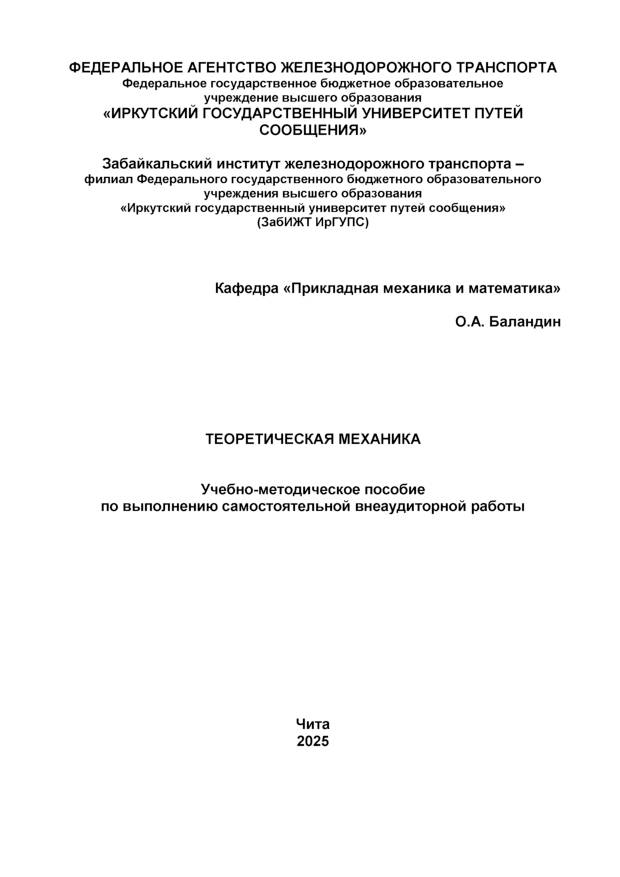 | Балданова Е.А. CONVERSATION TOPICSГод издания: 2018 Описание: учебное пособие Ключевые слова: иностранный язык, лексика, железнодорожные термины, тексты |  | Баландин О.А. Теоретическая механикаГод издания: 2025 Описание: учебно-методическое пособие по выполнению самостоятельной внеаудиторной работы (ЭЖД, СОД) Ключевые слова: теоретическая механика, самостоятельная работа |
