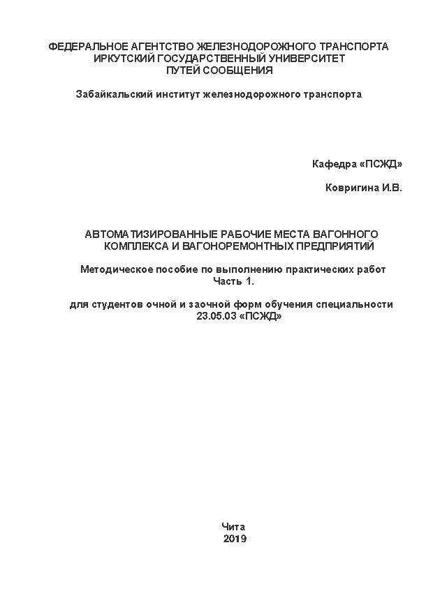 | Ковригина И.В. Вагонное хозяйствоГод издания: 2019 Описание: методическое пособие по выполнению курсового проекта |  | Ковригина И.В. Автоматизированные рабочие места вагонного комплекса и вагоноремонтных предприятийГод издания: 2019 Описание: методическое пособие по выполнению практических работ. Часть 1 |